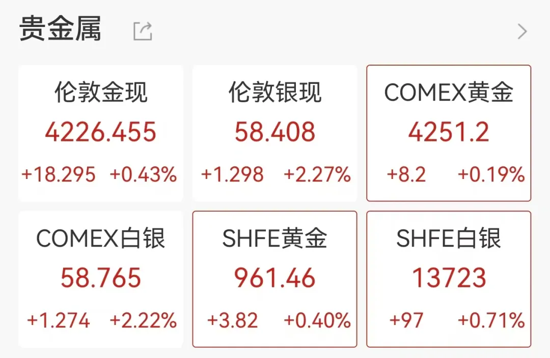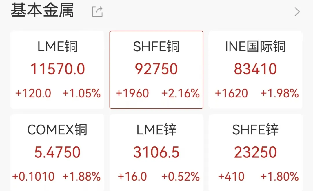 商品方面,LME伦铜涨幅扩大至约涨2%,纽约期银日内涨幅扩大至2%,黄金现货、期货也有不同程度涨幅。