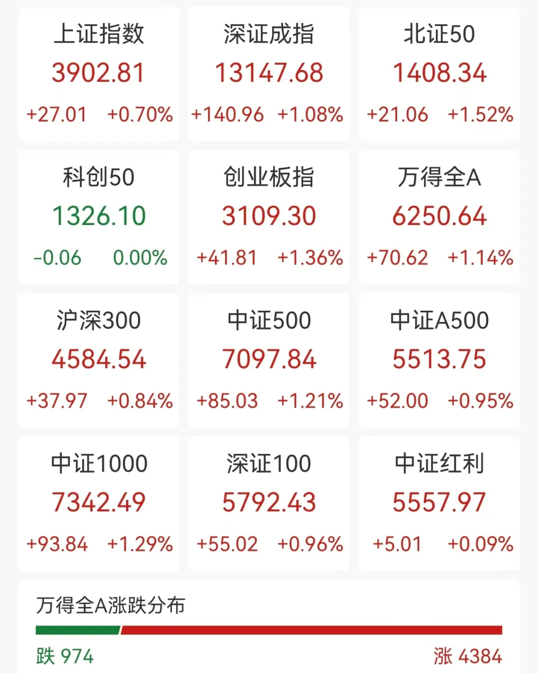 截至收盘,创业板指涨超1%,早盘一度跌超0.5%。沪深两市成交额1.73万亿,较上一个交易日放量1768亿,全市场近4400只个股上涨。