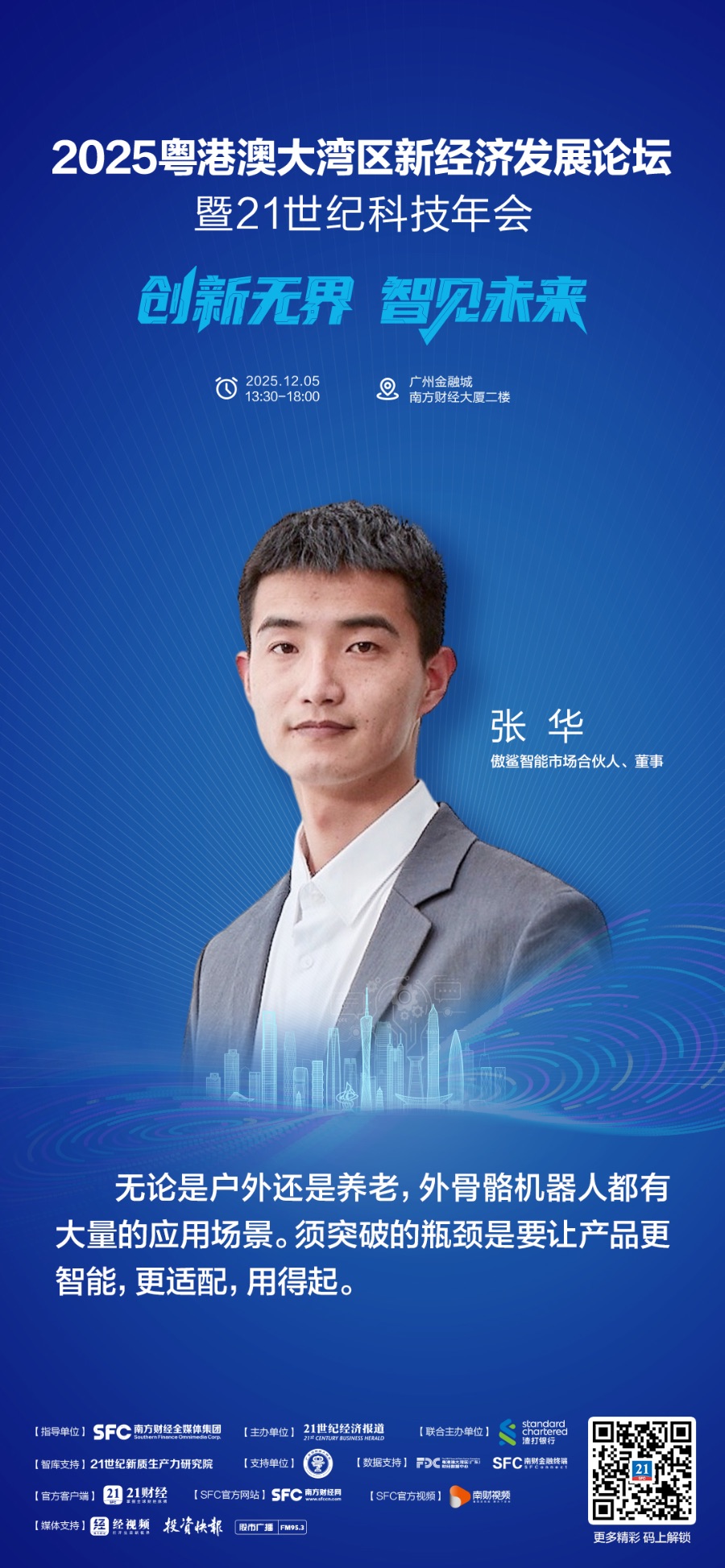 作为“南方财经论坛2025年会”的重要专题会议之一,本届科技年会以“创新无界智见未来”为主题。在聚焦“AI驱动的新经济图景”的圆桌论坛上,傲鲨智能市场合伙人、董事张华表示,外骨骼机器人行业已从早期专用场景转向通用化发展,结合AI技术与政策支持,正迎来市场增量机遇。