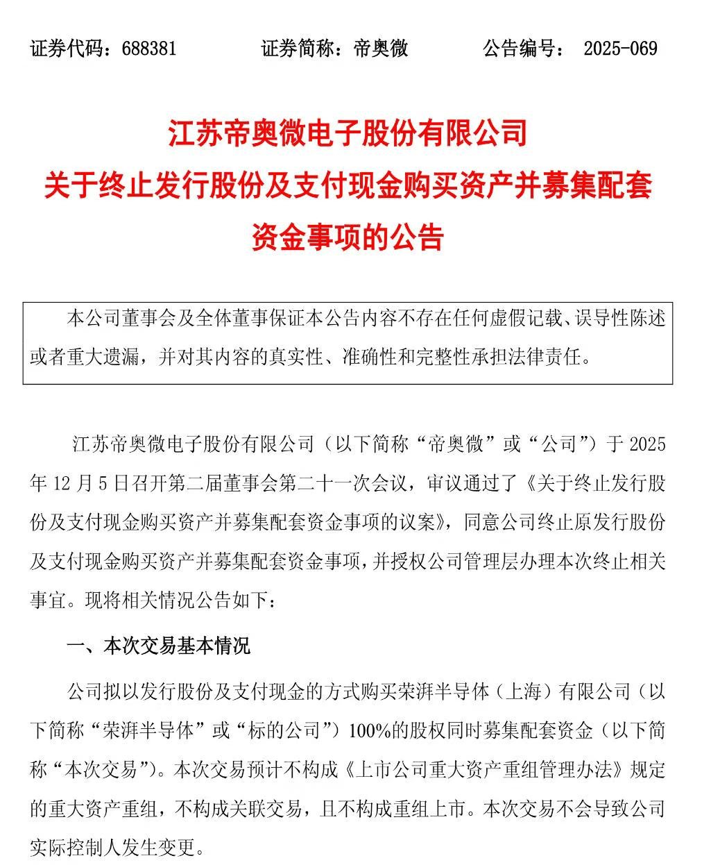 12月5日晚,帝奥微(688381)发布公告称,公司决定终止发行股份及支付现金购买荣湃半导体(上海)有限公司100%股权并募集配套资金事项。