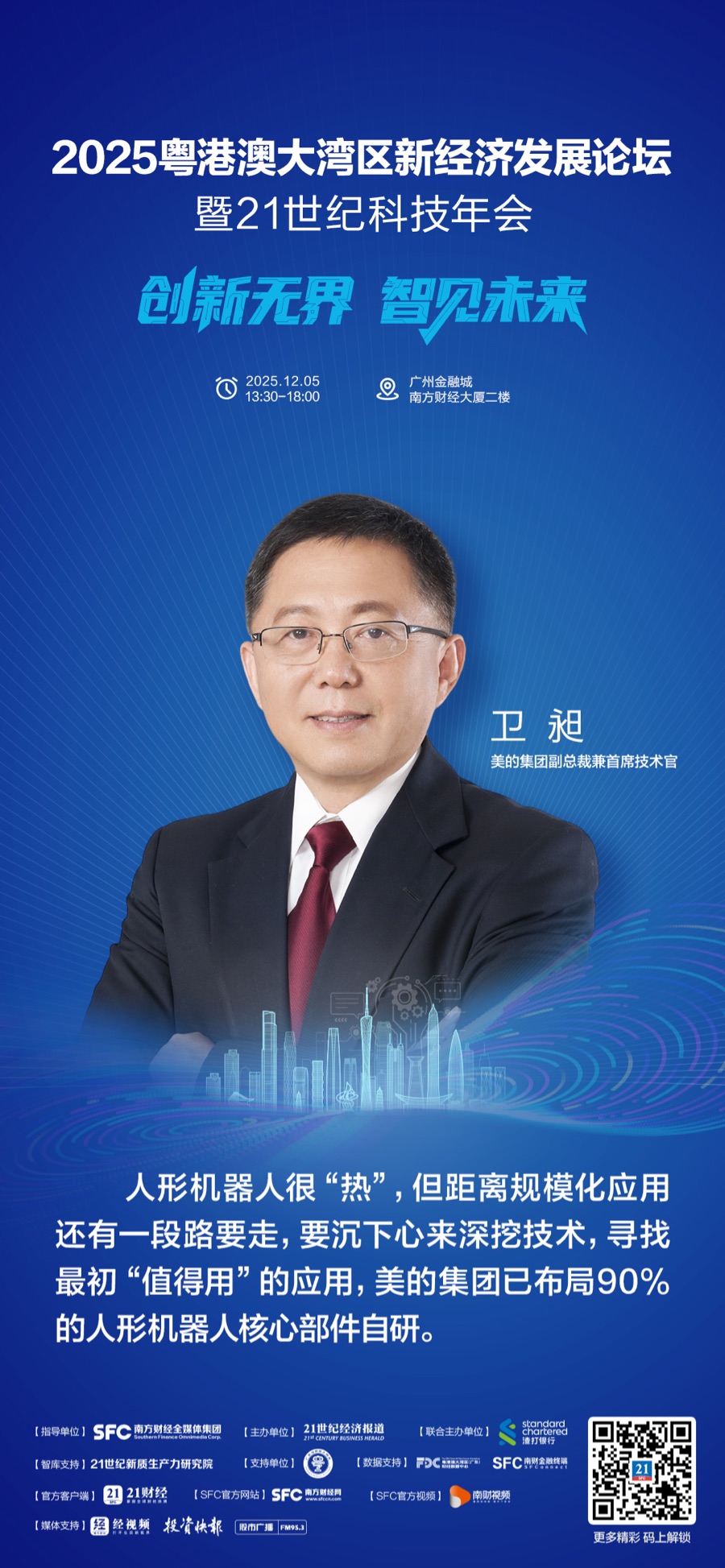 12月5日,由南方财经全媒体集团指导,21世纪经济报道和渣打银行联合主办,由广东省机器人协会支持的“粤港澳大湾区新经济发展论坛暨21世纪科技年会”在广州南方财经大厦举行。作为“南方财经论坛2025年会”的重要专题会议之一,本届科技年会以“创新无界 智见未来”为主题,汇聚来自产业、科研、投资与政策领域的顶尖力量,探讨AI时代真正可持续的产业路径。