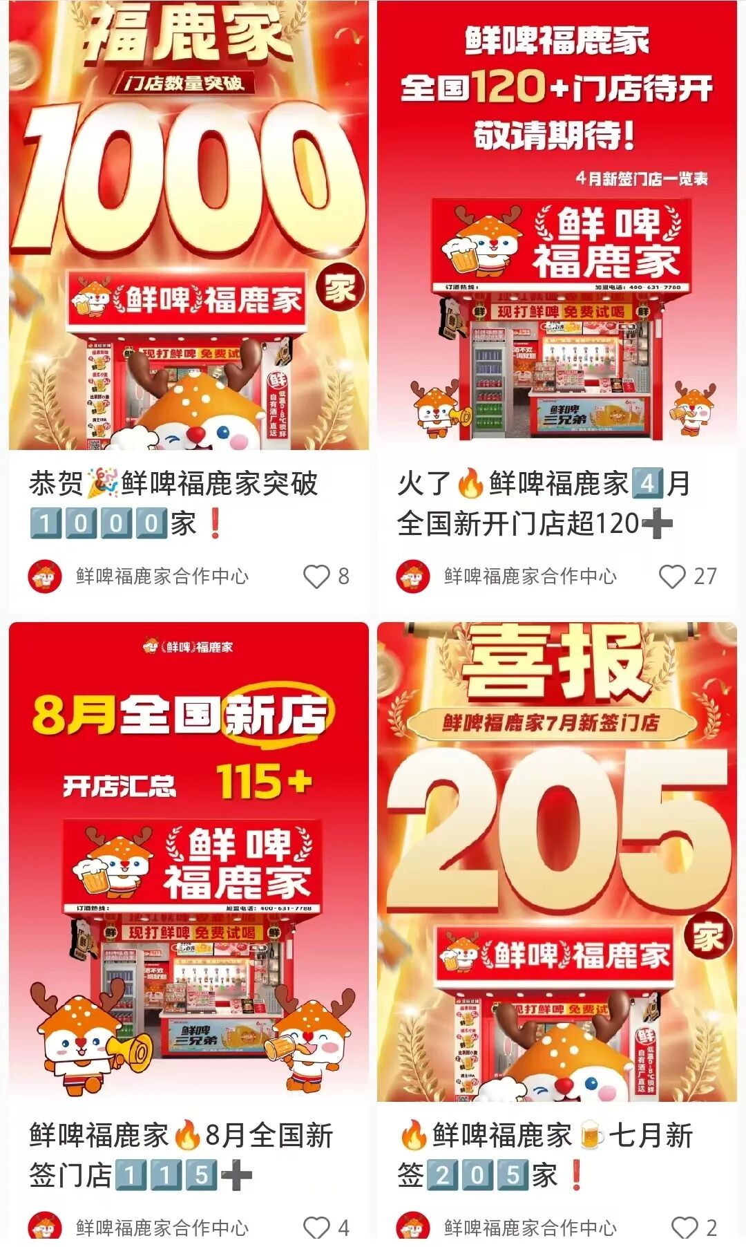 凭借优惠的加盟优惠政策,福鹿家的全国门店数实现了快速扩张。据官方披露,今年第二、第三季度,福鹿家门店数单月新增均稳定在100-200家区间,截至6月其全国门店就已突破1000家。截至近日,据鲜啤福鹿家合作中心主页介绍,目前其全国门店数已突破1500家,覆盖22个省份、300多个地、市、区。