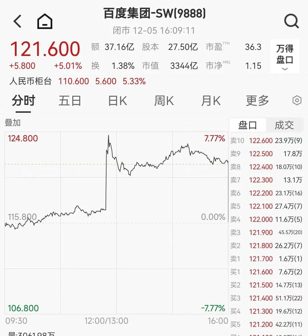 截至12月5日,百度港股午后突然直线拉涨,一度涨近8%。随后涨幅收窄,截至收盘涨超5%,报121.6港元/股,总市值为3344亿港元。