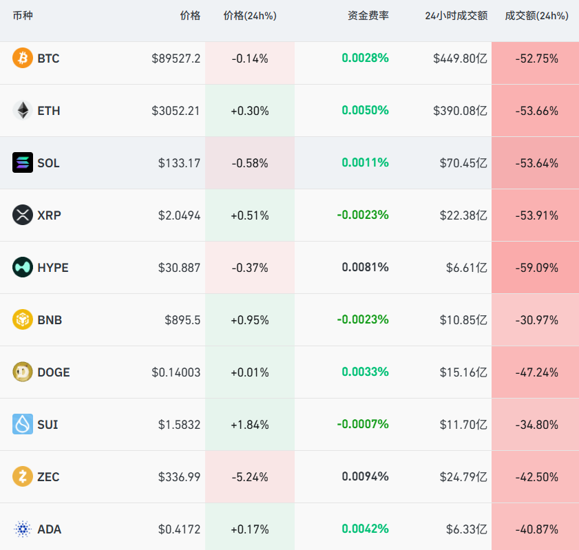 12月7日早上,比特币一度向下跌破89000美元,而在6日晚它曾向上触及9万美元。截至7日11:09,加密货币市场涨跌互现,主要品种成交额全线大幅下跌,近24小时内,比特币、以太坊、SOL等主要品种成交额均腰斩,跌超50%。