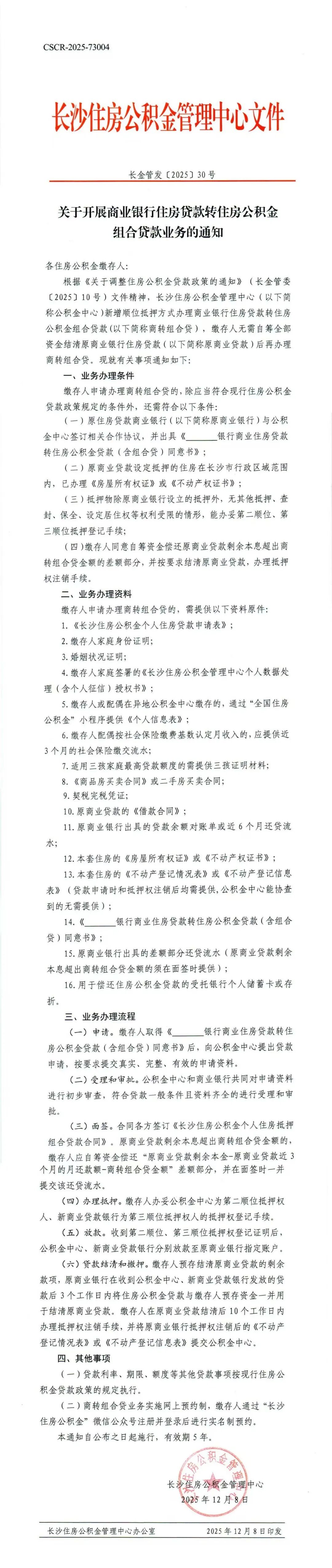 今日(12月8日),长沙市住房公积金管理委员会及长沙住房公积金管理中心集中发布三项新政,包括调整住房公积金贷款政策、开通商转组合贷业务、上线公积金直付房租服务,所有政策均于当日起正式施行,从购房门槛、贷款便利度、租房保障三方面精准支持缴存人住房需求。
