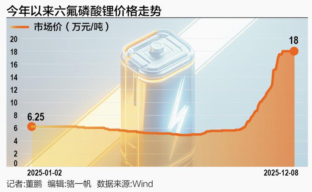 相关数据显示,今年9月末,六氟磷酸锂价格保持在6.1万元/吨,至12月8日已经升至18万元/吨,四季度以来涨幅达到195%。