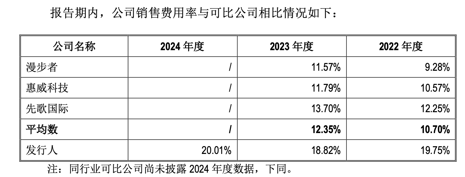 公司披露的报告期(2022-2024年)内,销售费用率维持在18.85%-20.43%区间,显著高于同行业平均水平的6.54%-9.09%。