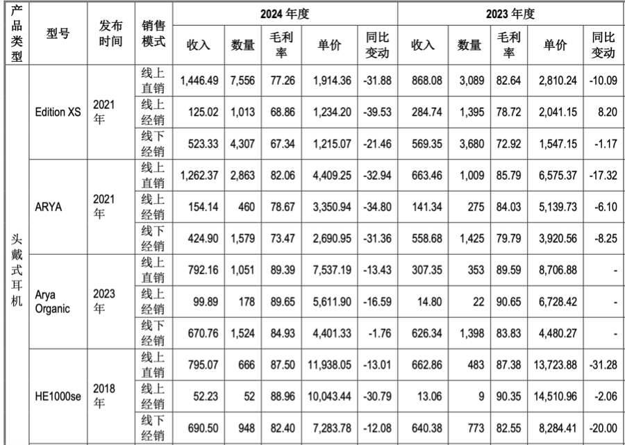 举例来说,在高毛利率来源的头戴式耳机市场,海菲曼于2021年发布的头戴式耳机Edition XS,到2024年线上直销单价同比降幅达31.88%,毛利率从82.64%下滑至77.26%;2023年推出的真无线耳机Svanar Wireless系列,短短一年间毛利率也从84.25%下滑至78.73%。