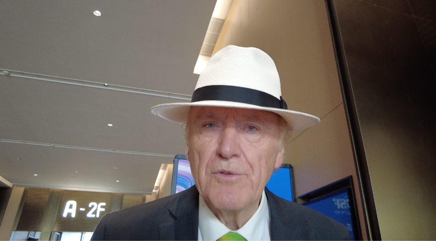 (德国经济文化促进会主席艾哈特·劳在2025年大湾区科学论坛上接受21世纪经济报道记者采访,摄影:赖镇桃)