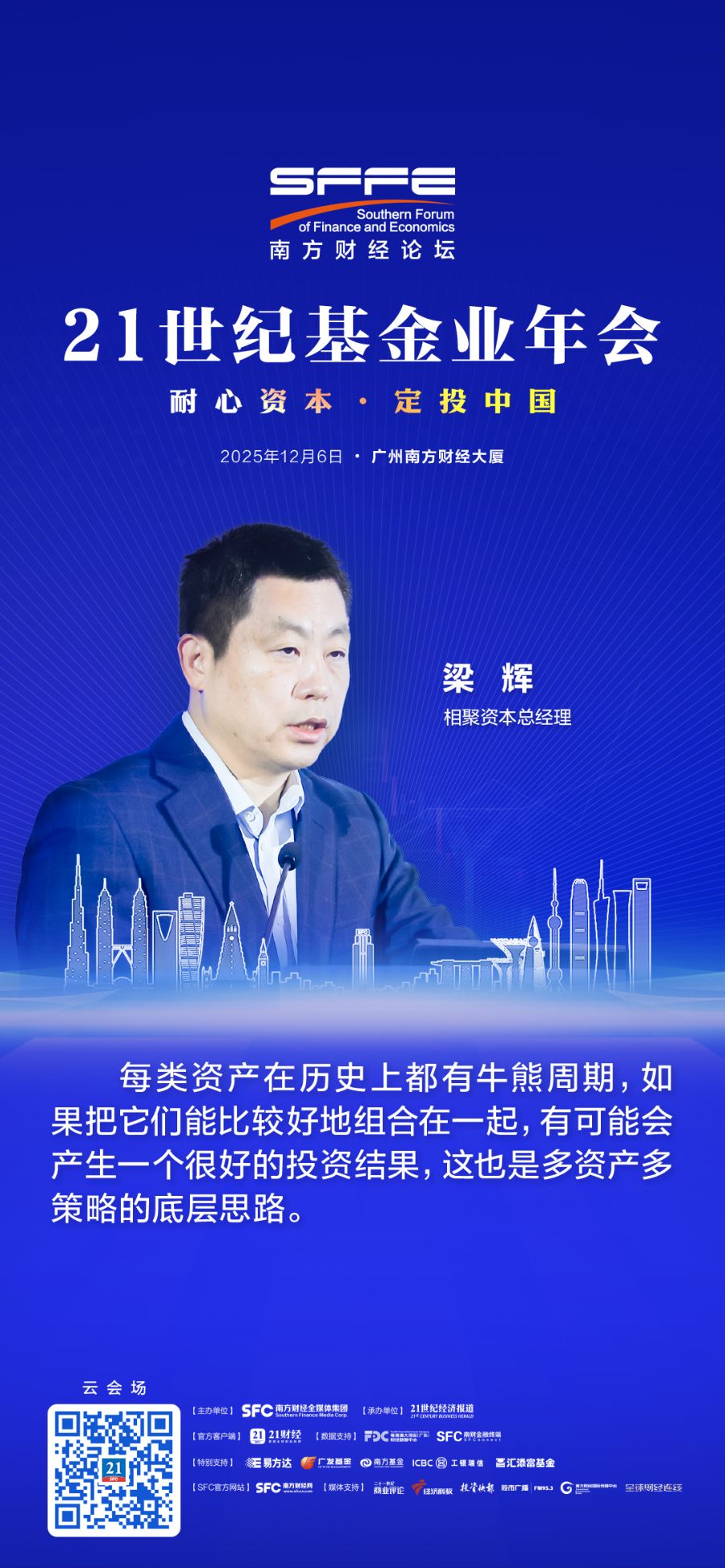 12月6日,在南方财经论坛2025年会、21世纪基金业年会上,相聚资本总经理梁辉发表了题为《不确定市场的绝对回报思考——2026年投资展望》的主题演讲,从A股、美股、AI产业趋势及资产配置等多个维度,系统阐述了其核心研判。