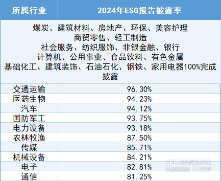 目前已披露ESG报告的443家企业中,共计有30个行业(按照申银万国行业划分),近两年来它们的信披率仍在提升。煤炭、建筑材料、房地产、环保、美容护理、商贸零售、轻工制造、社会服务、纺织服饰、非银金融、银行、计算机、公用事业、食品饮料、有色金属、基础化工、建筑装饰、石油石化、钢铁、家用电器业全部披露了2024年ESG报告。信披率最低的行业是通信业,但也达到了81.25%。