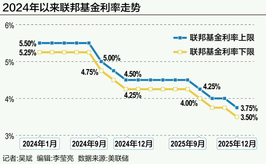 据央视新闻报道,当地时间12月10日,美国联邦储备委员会结束为期两天的货币政策会议,宣布将联邦基金利率目标区间下调25个基点到3.50%至3.75%之间。这是美联储今年第三次降息,也是自2024年9月以来第六次降息。