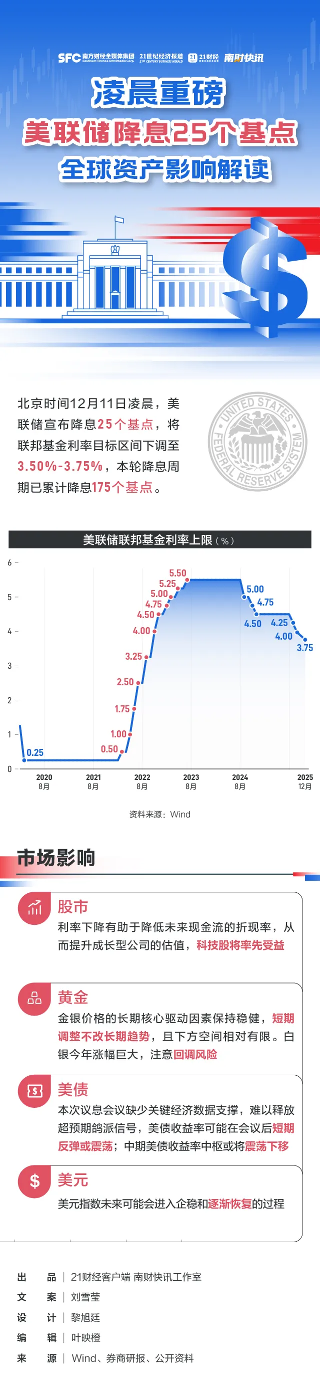 据央视新闻,美国联邦储备委员会10日结束为期两天的货币政策会议,宣布将联邦基金利率目标区间下调25个基点至3.5%至3.75%之间。