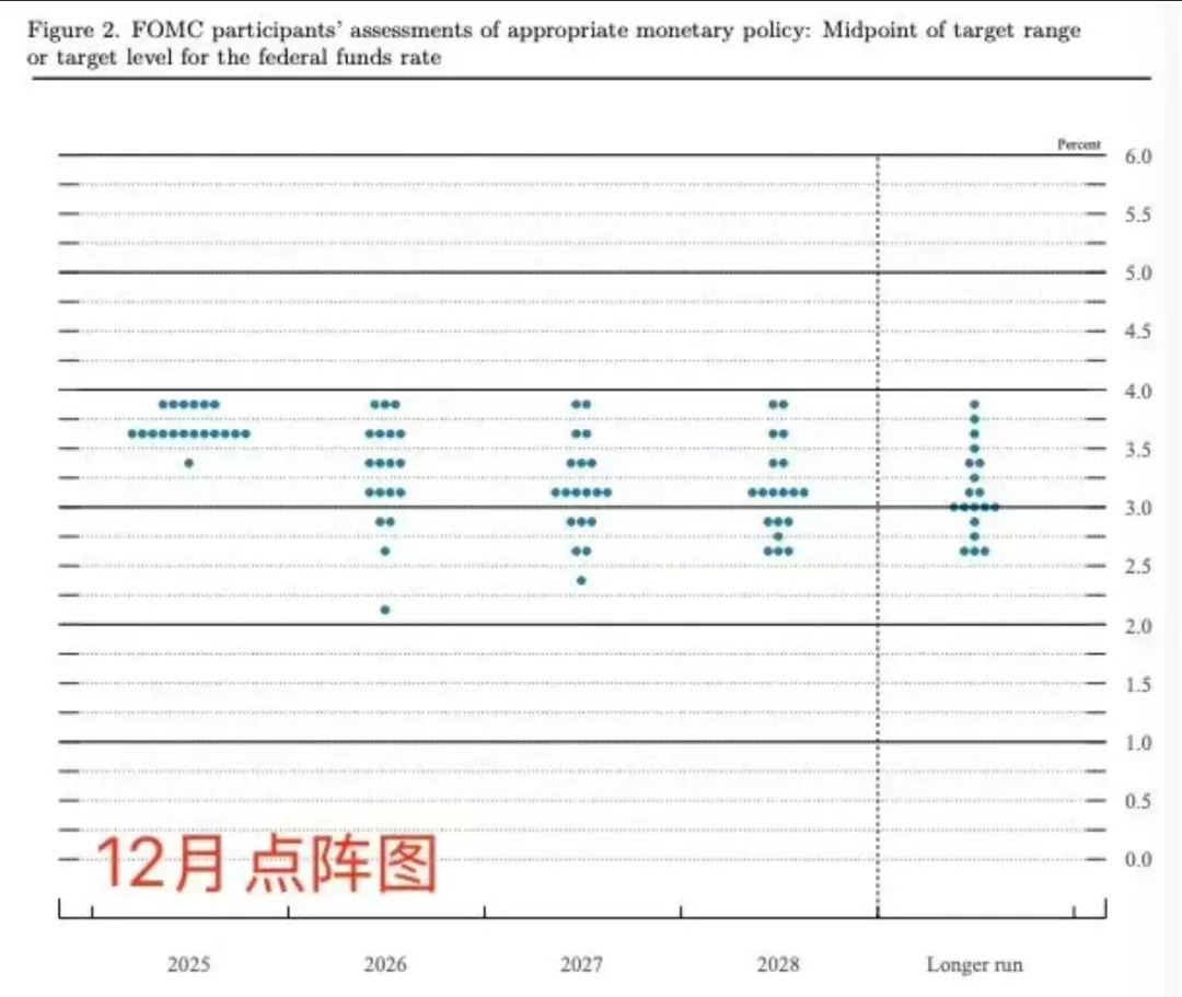 备受关注的“点阵图”显示,决策者预计2026年只会再降息一次,2027年再降一次,然后利率将回到3%的长期水平。 图源/财联社