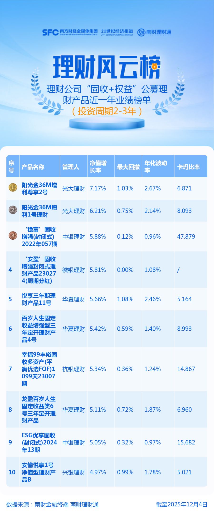 产品统计范围为理财公司发行的公募“固收+权益”理财产品,产品统计截止日期为2025年12月4日,统计区间为近一年。
