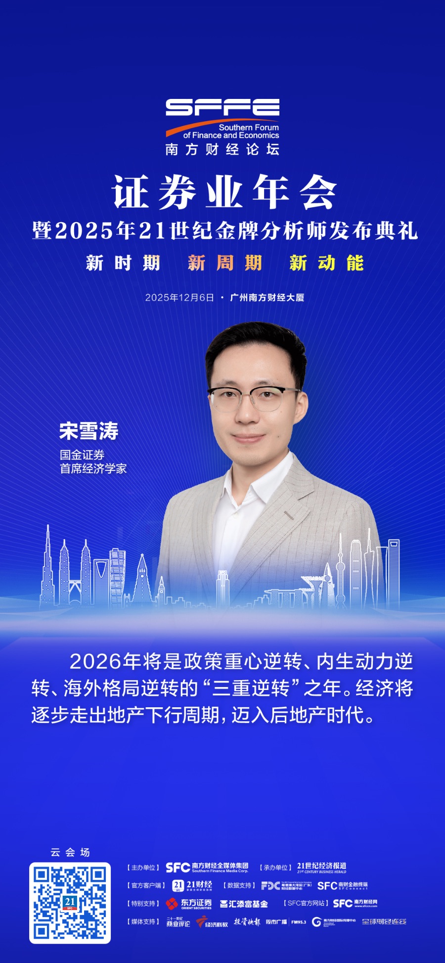 “2026年将是政策重心逆转、内生动力逆转、海外格局逆转的‘三重逆转’之年。经济将逐步走出地产下行周期,迈入后地产时代。”在南方财经论坛2025年会证券业分论坛上,国金证券首席经济学家宋雪涛如是表示。