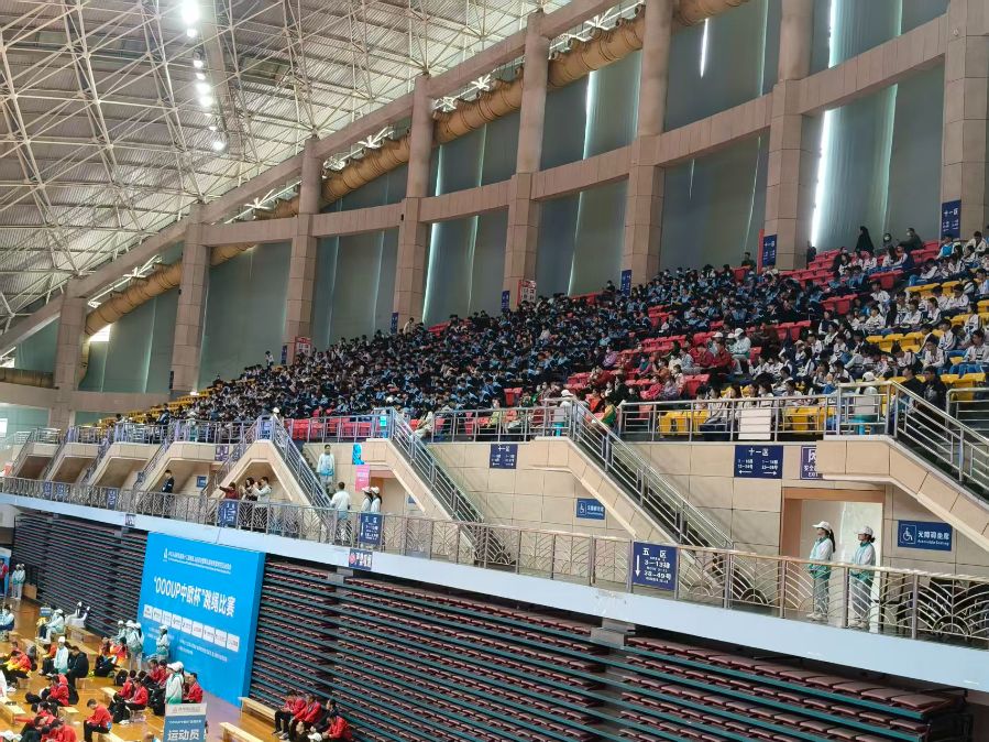 赛场上,运动员随着轻快的节奏挥动跳绳,身体不断变换姿势同步跃动,在近千名观众的欢呼声中,赛事气氛非常热烈。