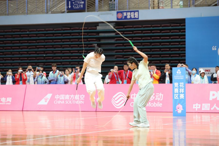 在惠州市体育馆,跳绳划破空气的脆响与轻快节奏交织,运动员们身形跃动、绳影翻飞,看台上不断响起欢呼声和掌声。