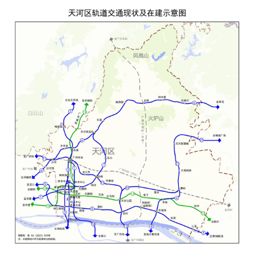 目前,天河区共规划完善轨道交通线路19条,设置站点约93座。加上在建线路,站点平均服务半径将小于700米,达到平均每平方公里有1个站点覆盖。