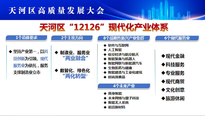 根据规划,天河力争打造5个千亿、5个500亿支撑的“12126”现代化产业体系。