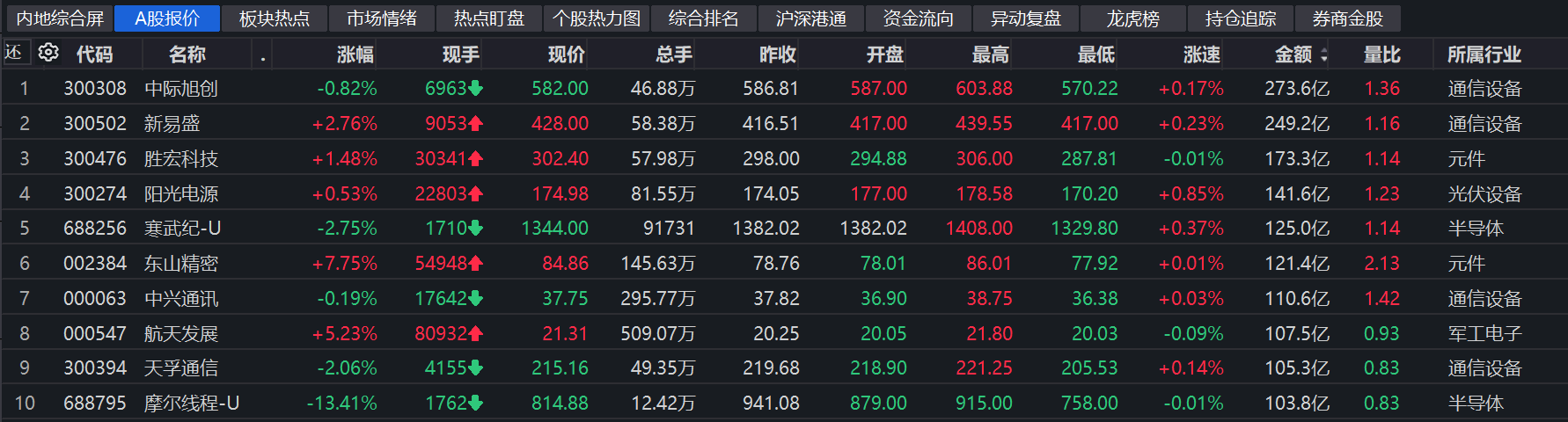 个股方面,中际旭创、新易盛成交额超200亿元,胜宏科技、阳光电源、寒武纪-U成交额靠前。