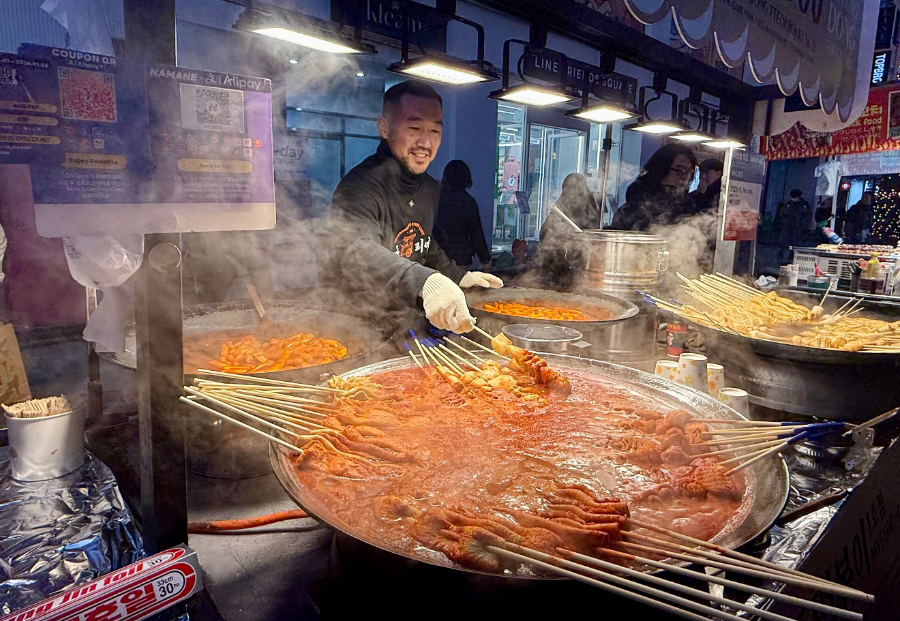 “以前语言不通,遇到海外客人不知如何交流,自从2023年接入支付宝和Alipay+后变得很方便,小摊销量增加了三倍,”明洞夜市一位网红年糕摊主表示。