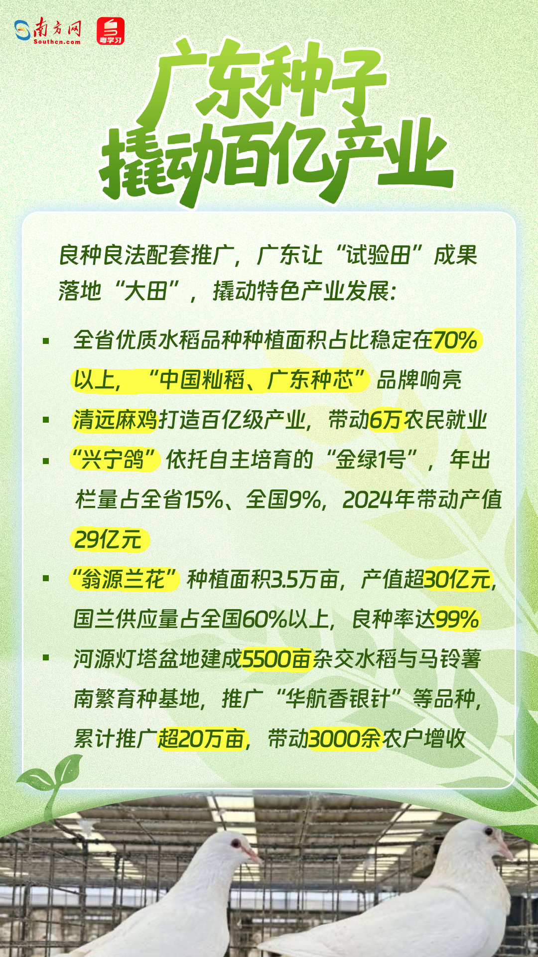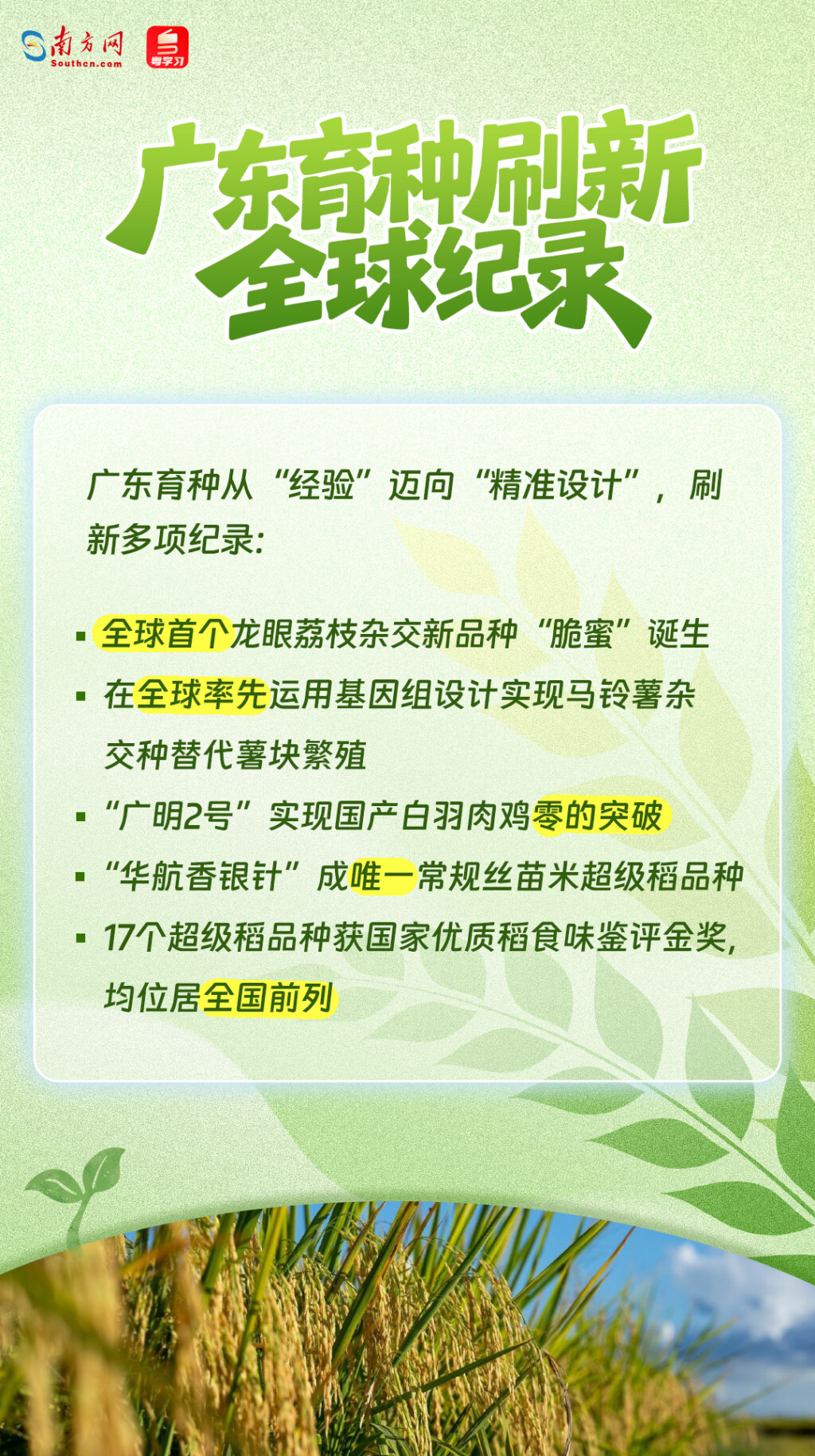 这扇窗口背后,是广东种业领跑全国的硬核实力——从“华航香银针”超级稻到“脆蜜”龙眼荔枝杂交果,从国产白羽肉鸡零的突破到千亿级产业集群,为种业振兴“五年见成效”提交了一份亮丽答卷。
