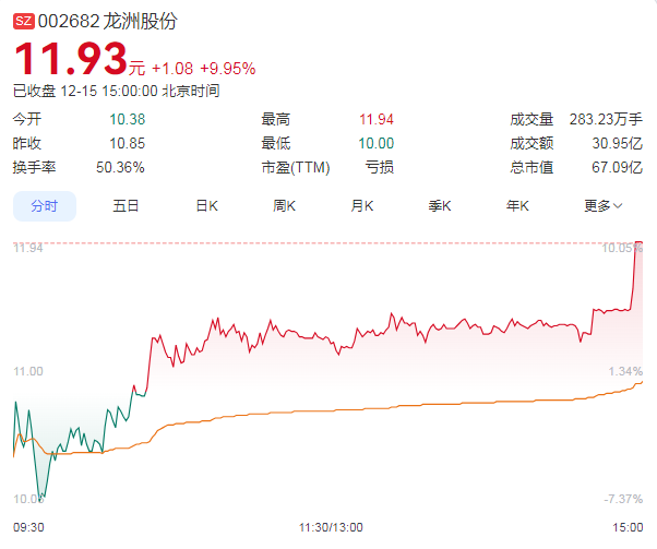 12月15日,龙洲股份逆势大涨9.95%,收盘价11.93元,成交额为30.95亿元,总市值攀升至67.09亿元。据统计,自11月28日以来的短短12个交易日内,龙洲股份股价累计涨幅已超过122%,表现非常亮眼。