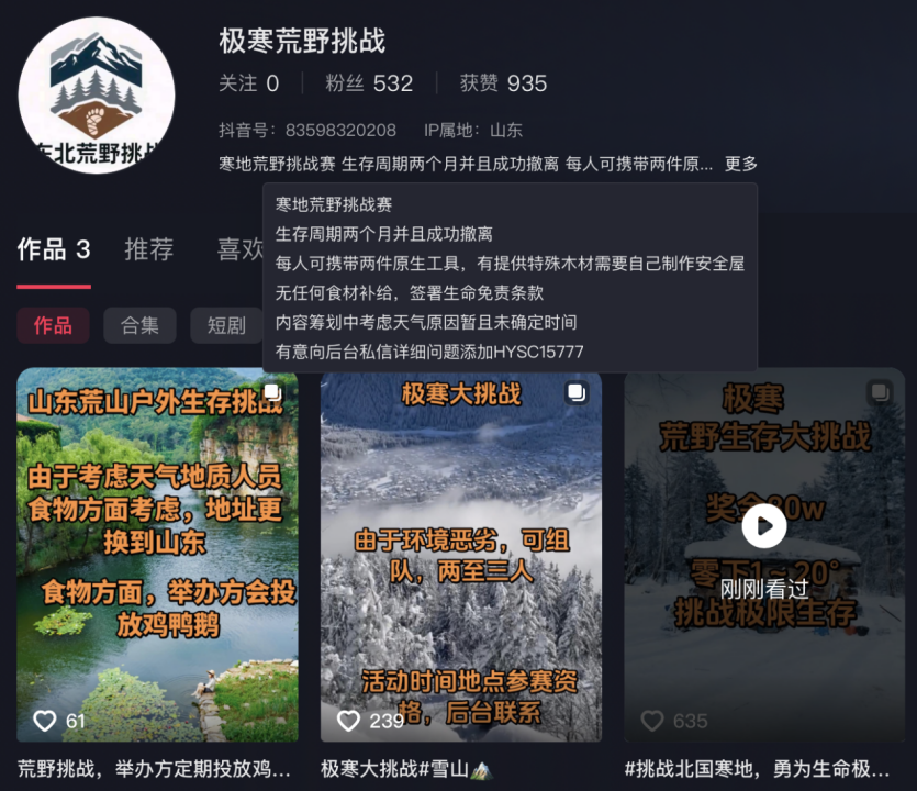 更荒诞的报名帖在社交平台层出不穷。某个人账号发布“东北极寒荒野生存挑战赛”,号称奖金有80万元,要求选手在零下20度的环境里生存至少两个月并安全撤离,还要签“生死状”。