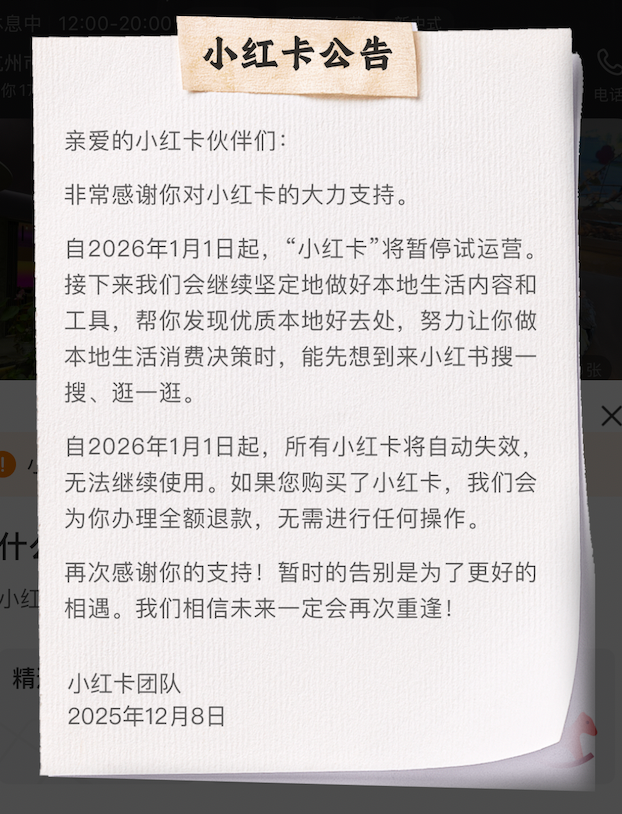 12月8日,小红书一则“小红卡将于2026年1月1日起暂停试运营”的公告,引发行业关注。