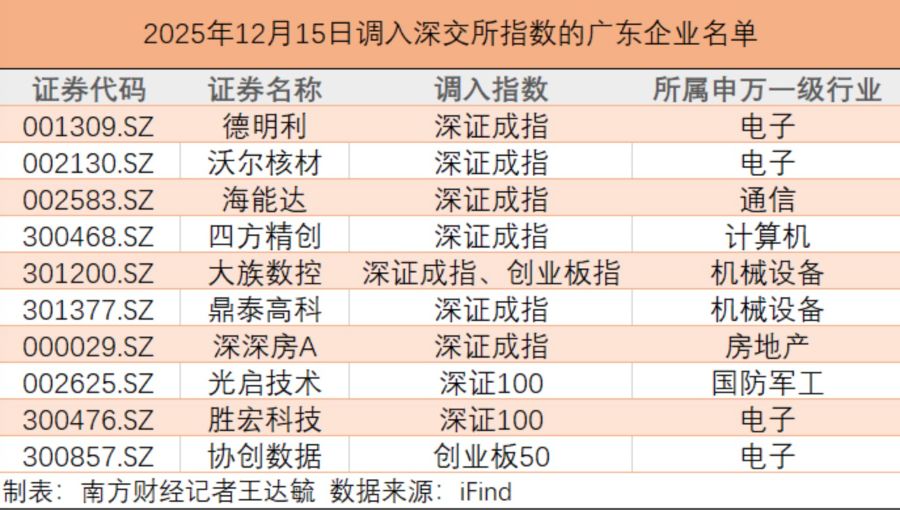 南方财经记者梳理发现,此次调整共有7家广东上市公司被调入深证成指,分别为:德明利(001309.SZ),沃尔核材(002130.SZ),海能达(002583.SZ),四方精创(300468.SZ),大族数控(301200.SZ),鼎泰高科(301377.SZ),深深房A(000029.SZ),所属行业覆盖电子、通信、计算机、机械设备等领域。