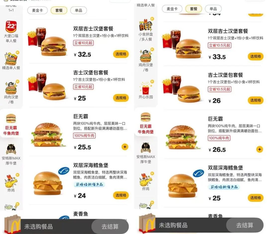 此外,备受网友关注的“1+1随心配”套餐价格并未调整,仍为13.9元起,但其中搭配不同的单品,出现了1元涨幅的组合方式。