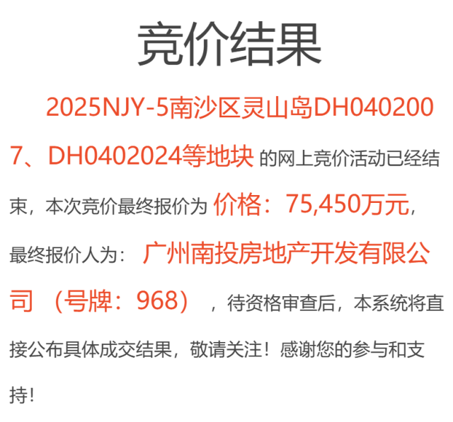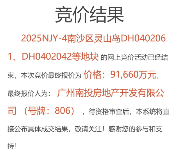 南沙推出灵山岛尖2025NJY-4和2025NJY-5两宗地块,都被广州南投地产拿下,成交总价分别为9.1亿元和7.5亿元,楼面价分别约为1.03万元/㎡和1万元/㎡(未扣除配建成本)。