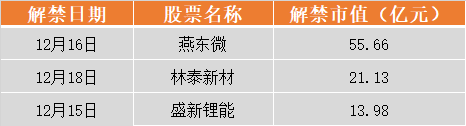 具体来看,燕东微12月16日将解禁1.93亿股,为首发原股东限售股份;林泰新材12月18日将解禁0.26亿股,为首发原股东限售股份;盛新锂能12月15日将解禁0.47亿股,为定向增发机构配售股份。