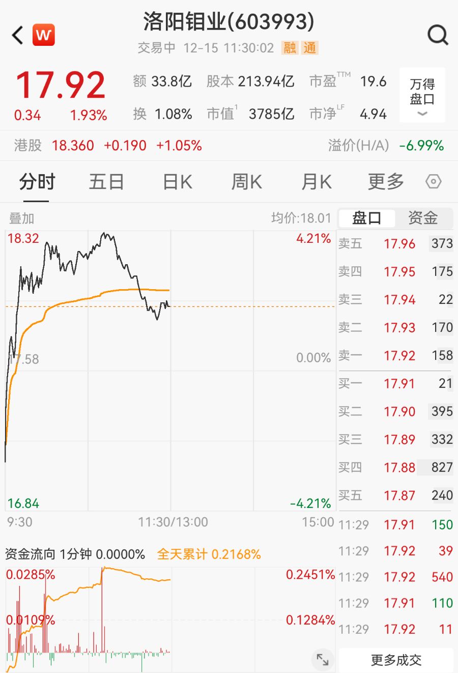 12月15日,矿业巨头洛阳钼业(603993.SH)开盘后强势拉升翻红,一度涨超4%,随后震荡走低。截至午间收盘,报17.92元/股,涨1.93%,总市值为3785亿元。或受益于全球贵金属价格飙涨,今年以来,洛阳钼业股价已涨超180%。
