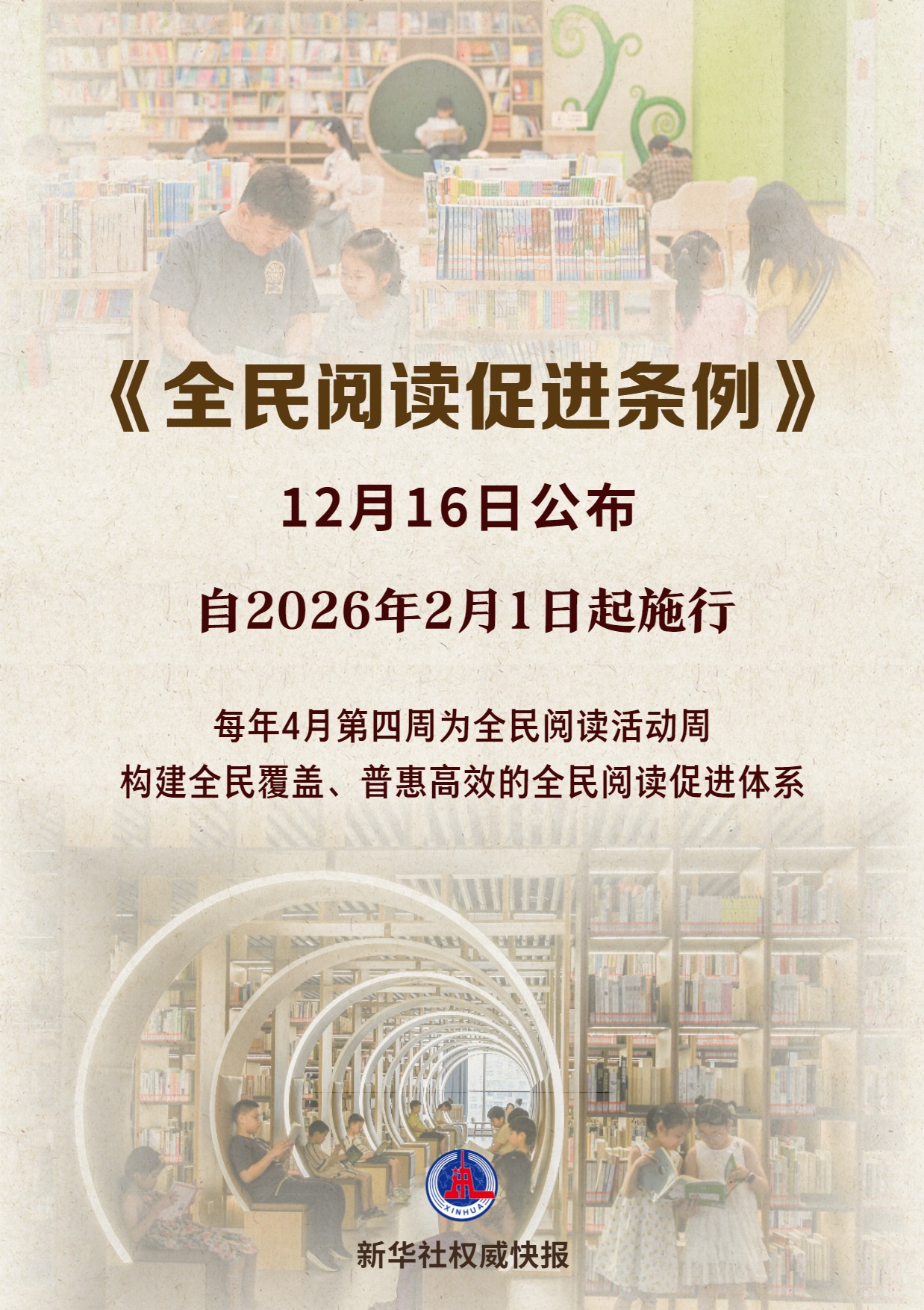 《全民阅读促进条例》12月16日公布,自2026年2月1日起施行。条例共6章45条,分为总则、全民阅读推广、全民阅读服务、全民阅读保障、法律责任和附则。