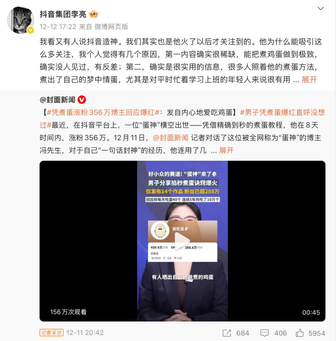 紧接着,12月12日傍晚,李亮再次发文否认算法“造神”。其背景是,抖音“悼明风”盛行的同时,一位被称为“蛋神”的健身爱好者迅速走红。这位来自山东的年轻人,在回应网友对“金沙纹路水煮蛋”的疑问时,给出了“水开下蛋,9分12秒捞出过凉水”的精准答案,从而引爆全网。