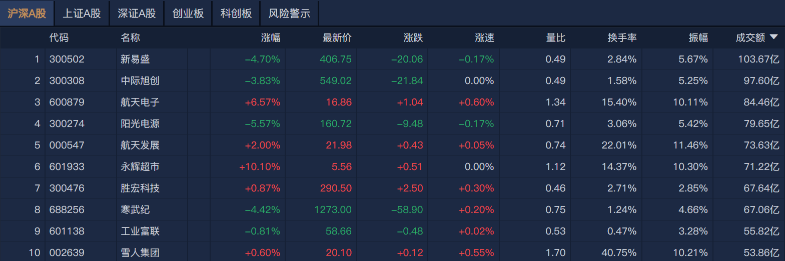 南财金融终端显示,个股方面,新易盛半日成交额超103亿元居首,中际旭创、航天电子、阳光电源成交额靠前。
