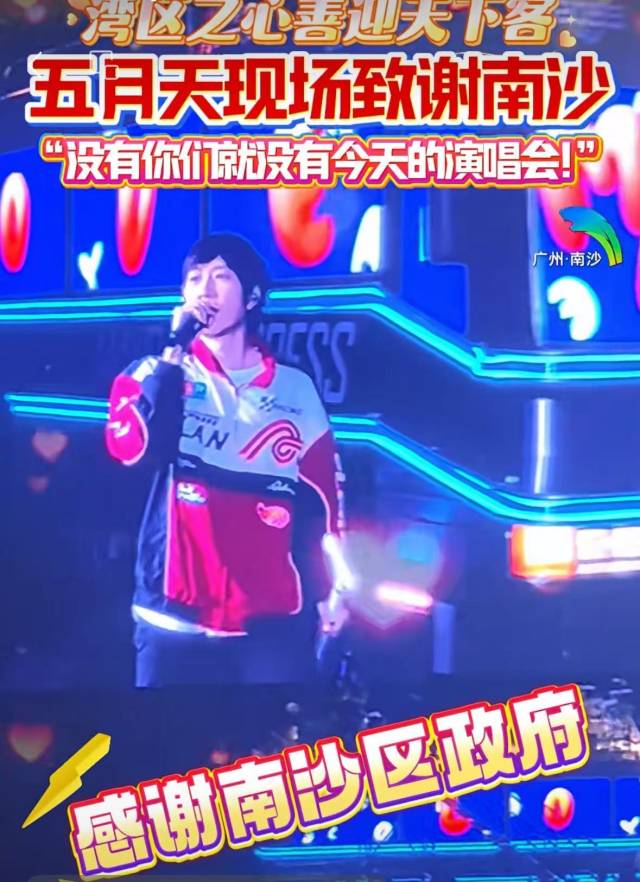 演出现场,五月天组合主唱阿信感谢南沙区政府、广州市公安局南沙分局、文旅、消防还有现场所有职能部门。“没有你们就没有今天的演唱会!”