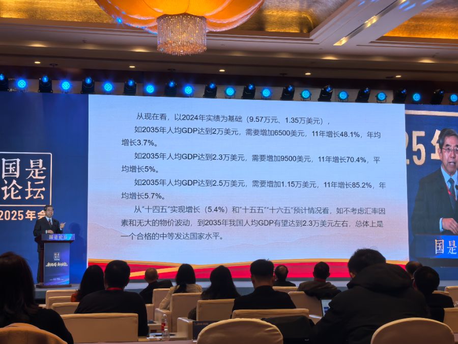 马建堂列出了一组数据:以2024年我国人均GDP约1.35万美元为基础,假定到2035年人均GDP达到2万美元(中等发达国家的门槛水平),需要增加6500美元,剩下的11年年均需增长3.7%;若要达到2.3万美元(15个国家的平均水平),需要增加9500美元,剩下11年每年要增长5%;若再加码,到2035年人均GDP达到2.5万美元,需要增加1.15万美元,剩下11年平均每年要增长5.7%。