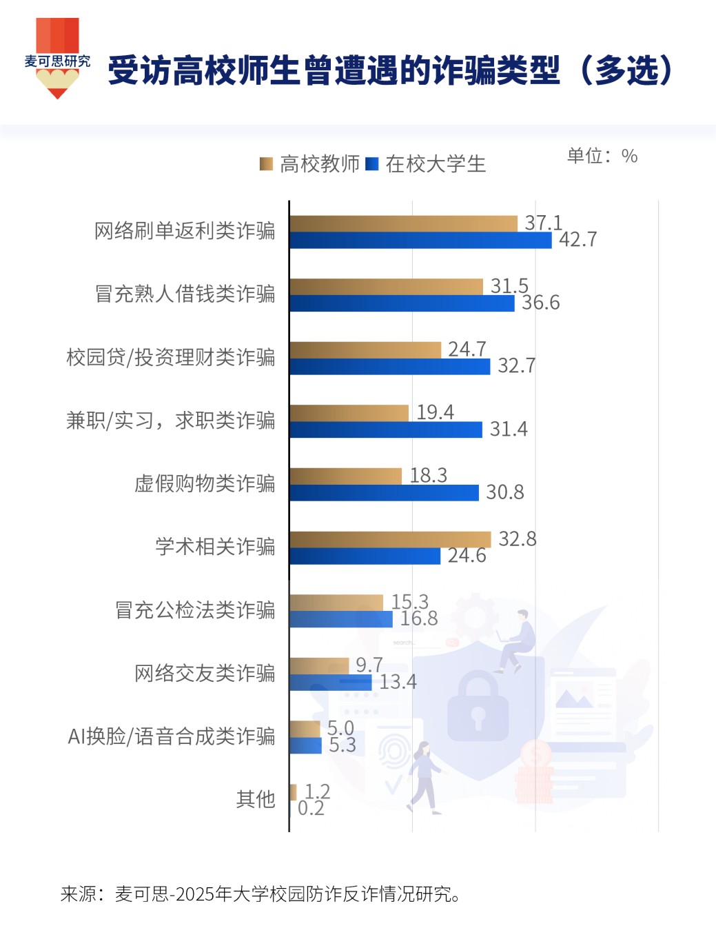 高校教师收到诈骗信息较多的有网络刷单返利类诈骗(37.1%)、学术相关诈骗(如虚假学术期刊、代发论文等,32.8%)、冒充熟人借钱类诈骗(31.5%)。