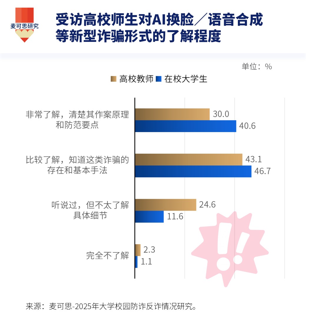 针对AI换脸/语音合成等新型诈骗,在校大学生的了解程度优于教师。数据显示,40.6%的在校大学生表示对这类诈骗非常了解,清楚其作案原理和防范要点;教师的该比例为30.0%。24.6%的高校教师表示听说过,但不太了解具体细节;该比例明显高于学生(11.6%)。