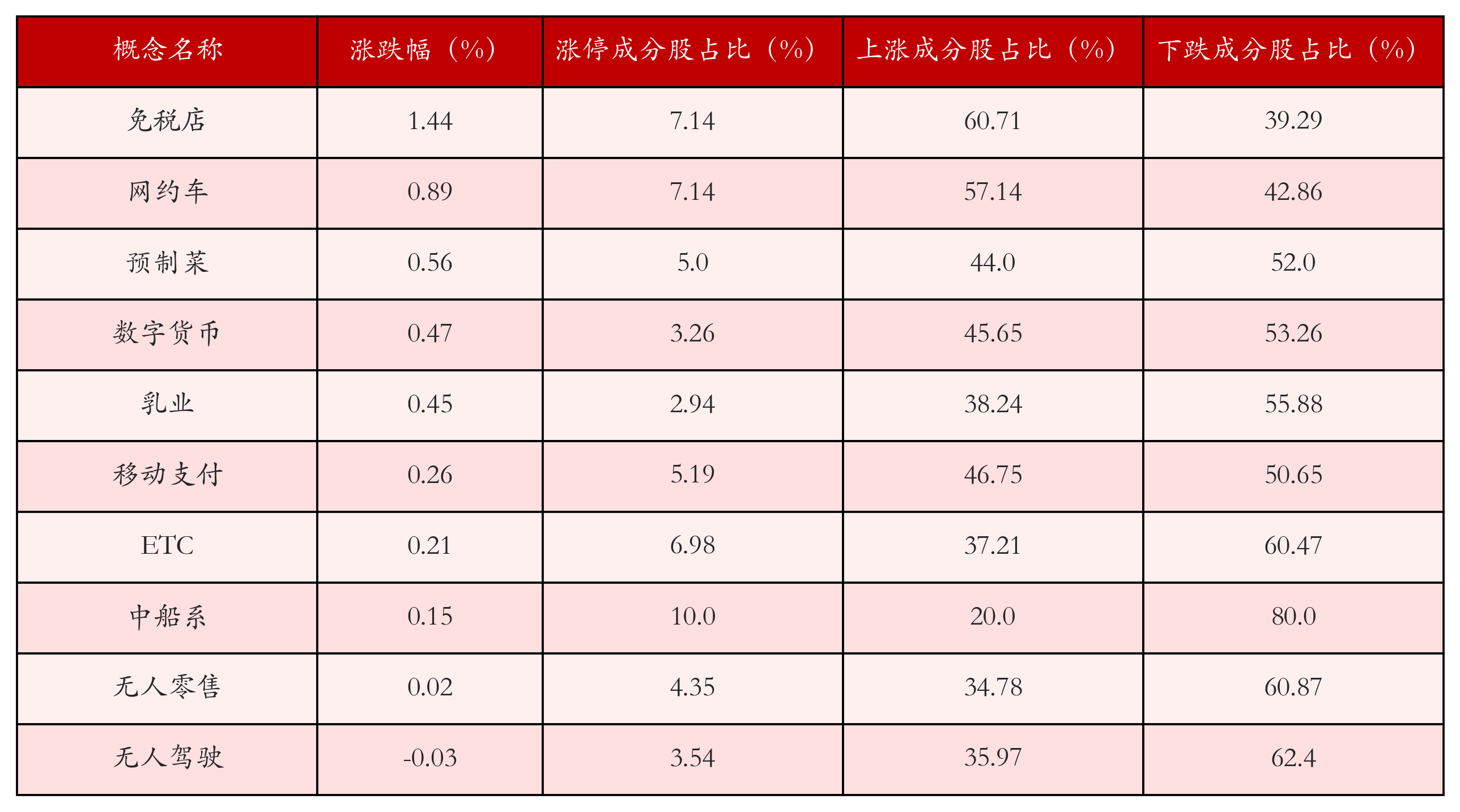 根据A股概念涨跌幅与所对应的股票池综合分析,涨幅靠前的三个概念板块分别为:免税店、网约车与预制菜。排名前10位的概念板块相关数据见下表: