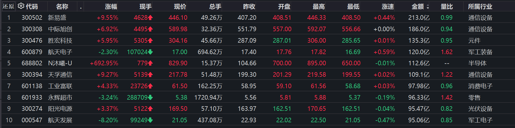 个股方面,新易盛成交额破200亿元,达213亿元,中际旭创、胜宏科技、航天电子等成交额靠前。
