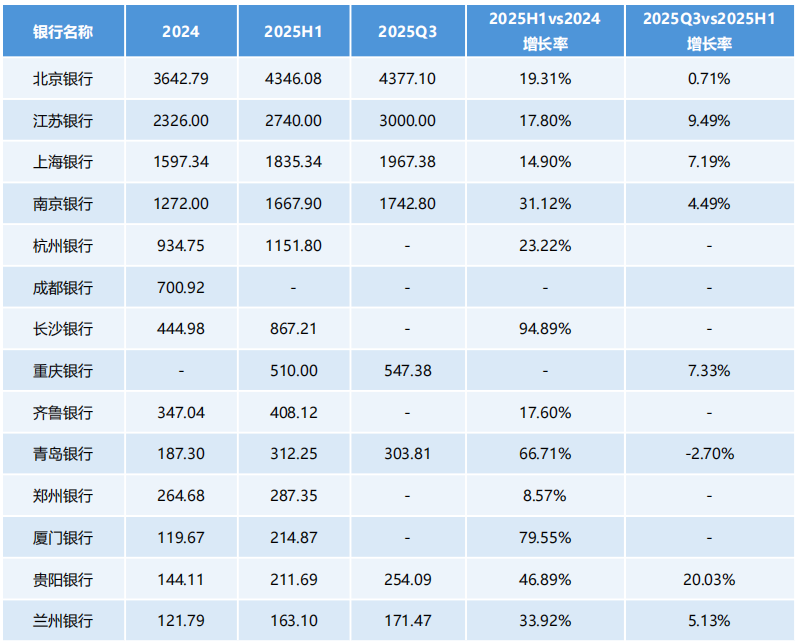 进入2025年第三季度,头部银行增速趋于平缓。北京银行增幅不到1个百分点、江苏银行、上海银行、南京银行等回落至个位数,分别为9.49%、7.19%和4.49%。青岛银行甚至出现-2.70%负增长。