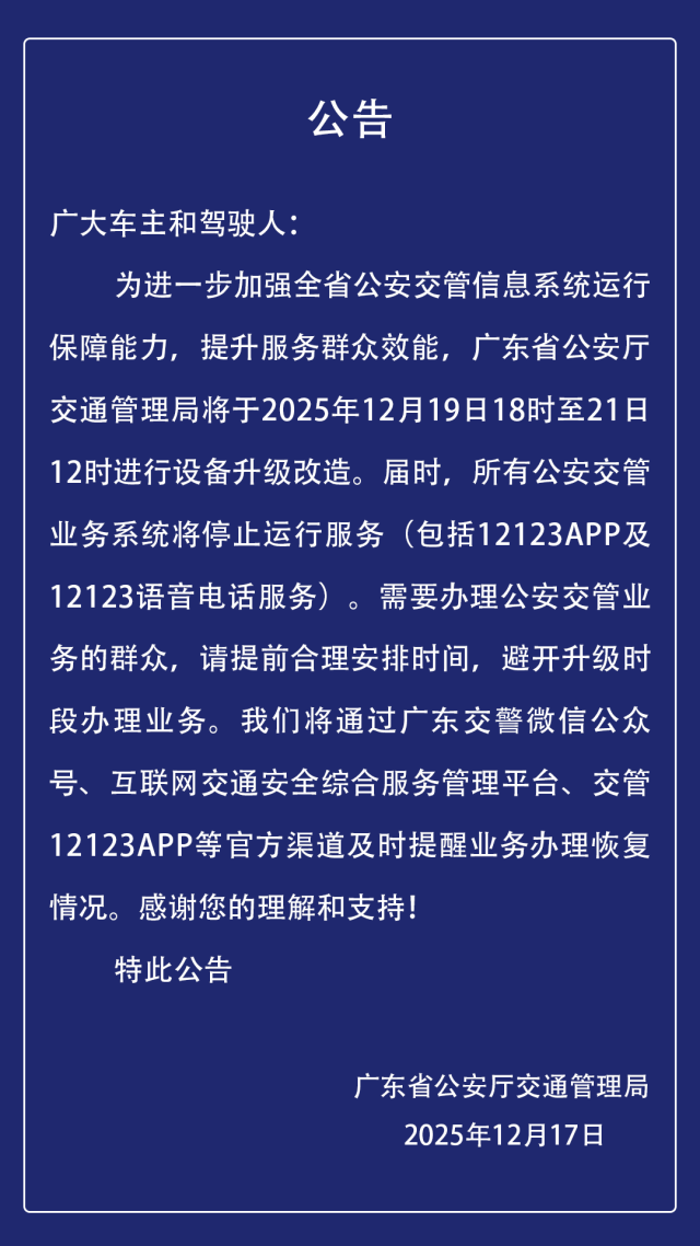 公告内容显示,为进一步加强全省公安交管信息系统运行保障能力,提升服务群众效能,广东省公安厅交通管理局将于2025年12月19日18时至21日12时进行设备升级改造。