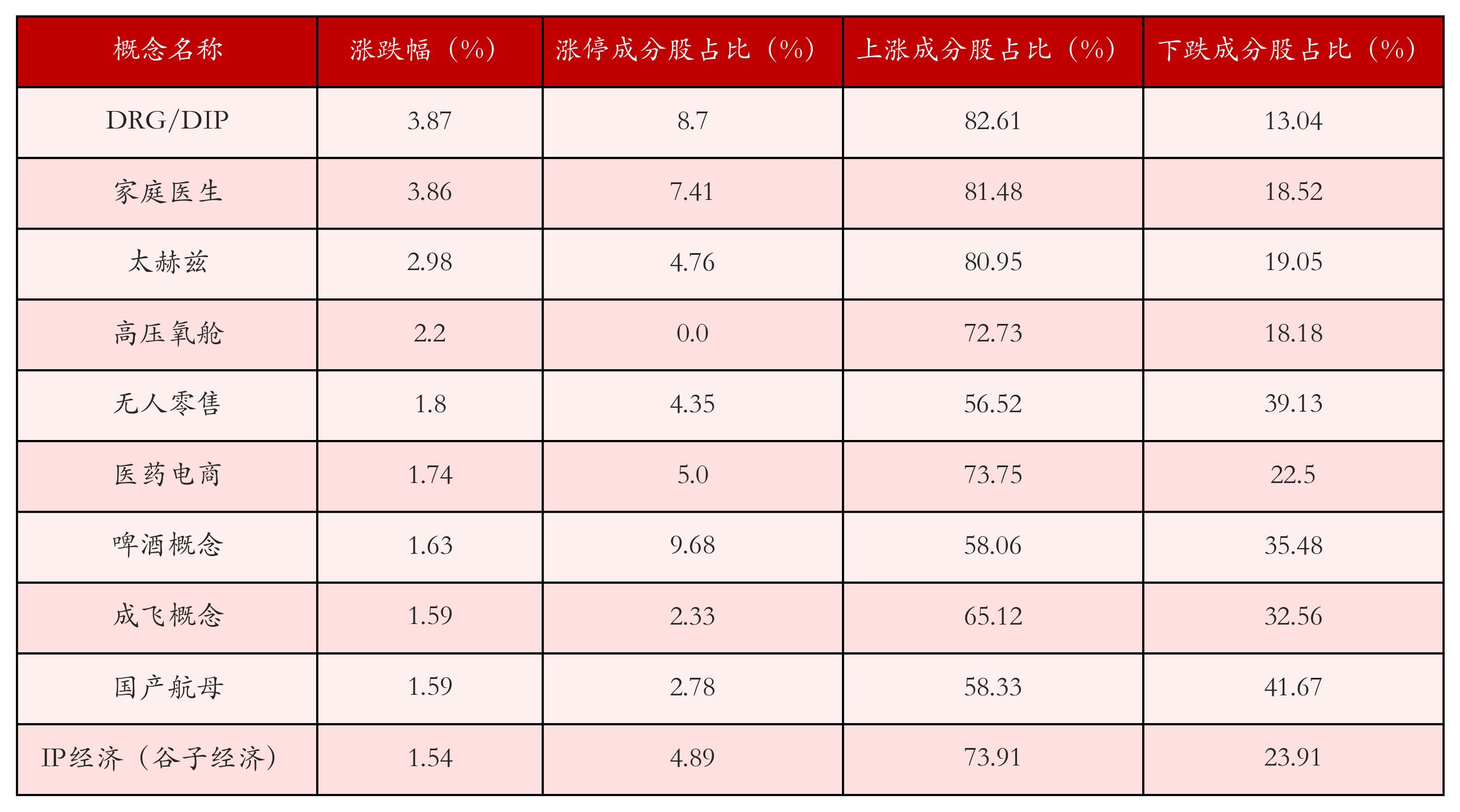根据A股概念涨跌幅与所对应的股票池综合分析,涨幅靠前的三个概念板块分别为:DRG/DIP、家庭医生与太赫兹。排名前10位的概念板块相关数据见下表: