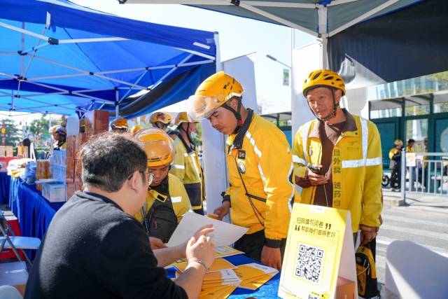骑手们在宣导活动现场向美团工作人员了解养老保险补贴政策。摄影:陈穗丰