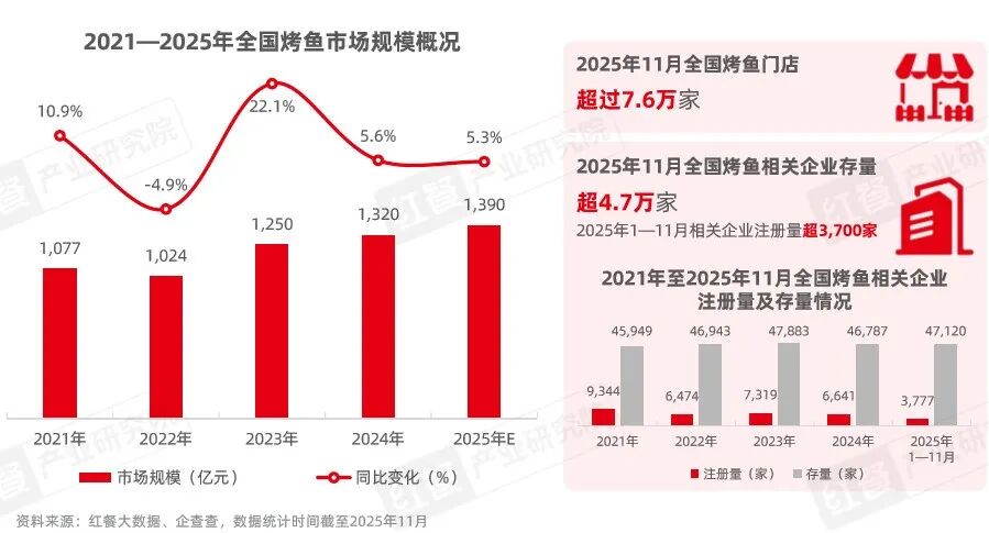 据红餐大数据,2025年烤鱼市场规模将延续近年稳定增长的发展态势,预计接近1,400亿元。门店方面来看,截至2025年11月,全国烤鱼门店数量超过7.6万家。同时,企查查显示,全国烤鱼相关企业存量超过4.7万家。