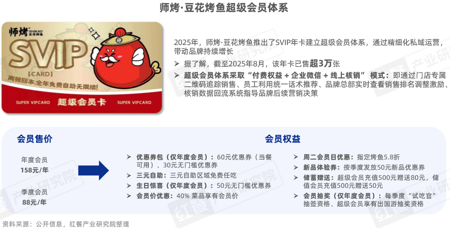 随着餐饮行业的获客成本逐步上升,私域运营逐步受到烤鱼品牌的重视。2025年,师烤·豆花烤鱼提出了超级会员体系,通过年度和季度会员制度,将消费者转化为付费用户,构建品牌私域流量。